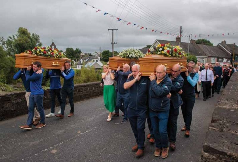 Mourners carry the coffins of murder victims Vanessa Whyte and her children, Sara and James Rutledge, through Maguiresbridge, Co. Fermanagh.
