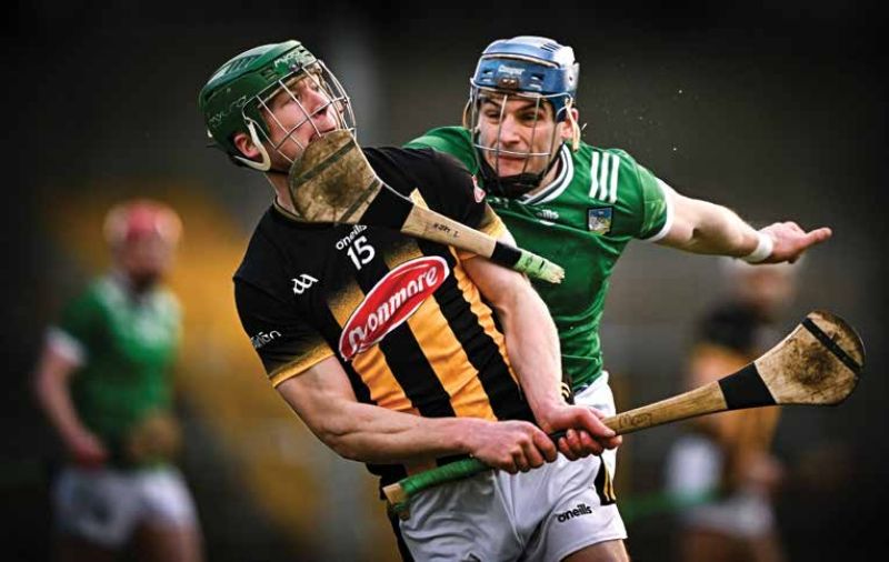 Martin Keoghan of Kilkenny scores a point as Mike Casey of Limerick breaks his hurley trying to stop the shot during the Allianz Hurling League Division 1A match between Kilkenny and Limerick at UPMC Nowlan Park in Kilkenny.
