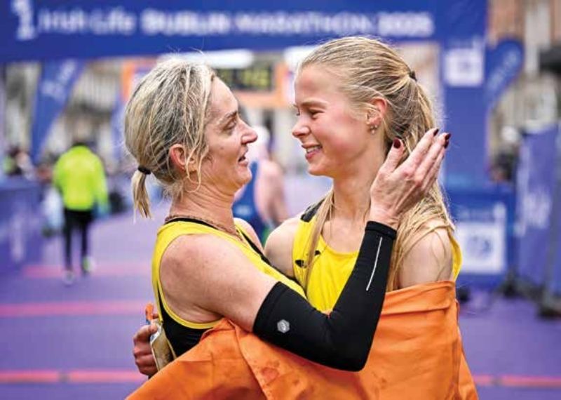 Women’s national marathon winner, 19-year-old Ava Crean of Back 2 Boston Running Club AC, Limerick, right, is congratulated by 2024 Women’s national marathon champion Ann Marie McGlynn of Strabane AC, Tyrone, who finished second at the 2025 Irish Life Dublin Marathon.